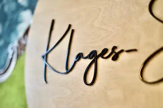Mit unserem intuitiven Online-Konfigurator wird die Gestaltung zum Kinderspiel: Bestimme Material, Farbe und Text und erschaffe ein Werk, das perfekt zu deiner Hochzeitsdekoration passt. Jedes Produkt wird mit modernster Lasertechnologie zugeschnitten, was eine präzise und saubere Verarbeitung garantiert.